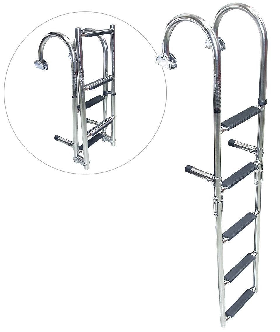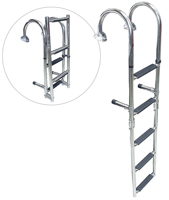 Складной трап из нержавеющей стали с Г-образным изгибом в верхней части. Обрезиненные ступени. Фиксированное крепление винтами.