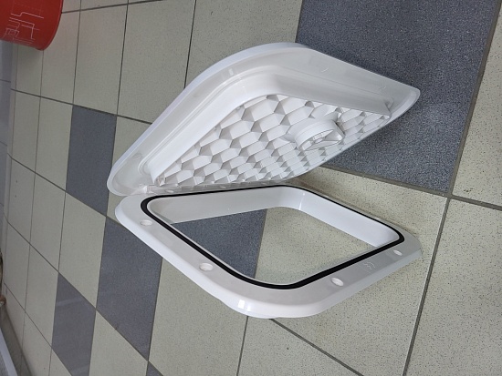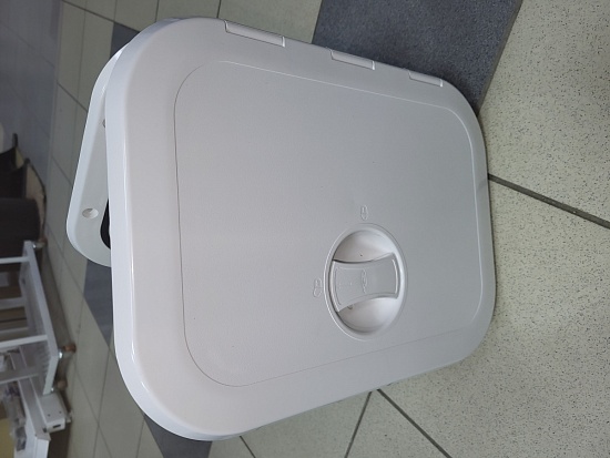 Люк прямоугольный размером 270х373 мм. Имеет новую систему устройства петель. Данная система позволяет снимать крышку люка без демонтажа рамки. Это позволяет производить замену крышки не меняя рамки, а так же производить необходимые работы сняв крышку и не демонтируя рамку. Это необходимо в случае, если открыть крышку полностью нет технической возможности из-за конструктивных особенностей катера, или других предметов, находящихся в непосредственной близости от люка. Страна производитель: Италия. Компания производитель: CAN SB