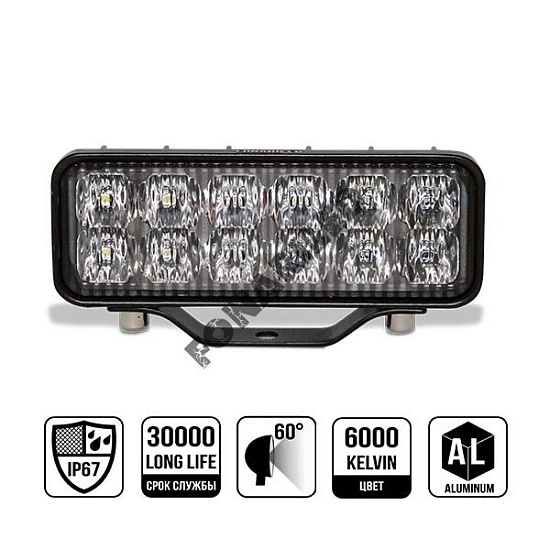 Профессиональная модель имеет мощность 36 Ватт с установленными 12 качественными диодами Osram, каждый по 3 Ватта высокой интенсивности. Рабочее напряжение 10-30 Вольт. Корпус сделан из высокопрочного литого алюминия. Монтажный кронштейн изготовлен в виде прочной скобы из металла покрытое нержавеющим напылением. Гарантия 12 месяцев.