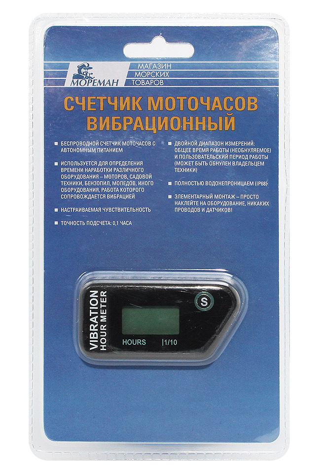 Беспроводной счетчик моточасов с автономным питанием. Используется для определения времени наработки различного оборудования – моторов, садовой техники, бензопил, мопедов, иного оборудования, работа которого сопровождается вибрацией (даже холодильника!). Элементарный монтаж – просто наклейте счетчик на оборудование с помощью двусторонней липкой ленты, входящей в комплект! Не требуется никаких проводов и датчиков! Двойной диапазон измерений: общее время работы (необнуляемое) и пользовательский период работы (может быть обнулен владельцем техники). Настраиваемая чувствительность. Точность подсчета: 0,1 часа. Полностью водонепроницаем (IP68) - допускает полное погружение в воду на глубину до одного метра. Срок службы - до 5 лет.