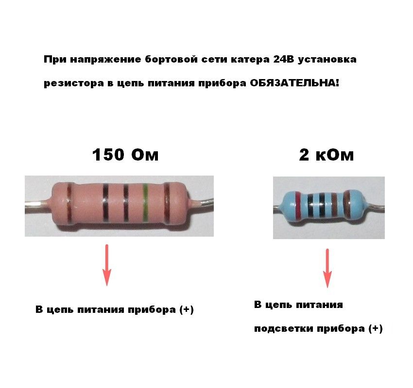 **При напряжении бортовой сети катера 24 В установка резисторов в цепь питания прибора обязательна.
