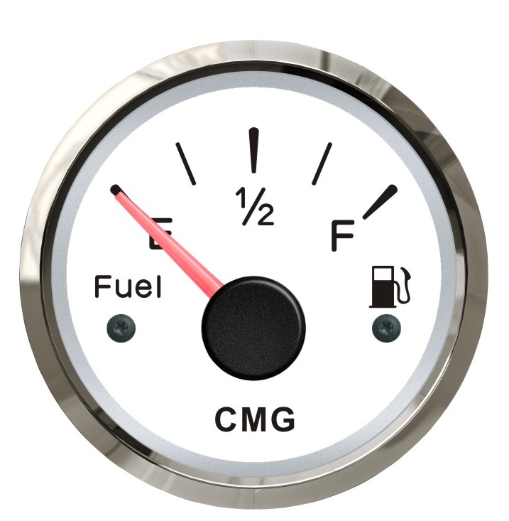 Указатель уровня топлива белый со стальной окантовкой диаметром 52 мм. Имеет внутреннее сопротивление 0-190Ω . Выбор красной или жёлтой подсветки Предназначен для работы с напряжением 12 В. Для адаптации под 24 в. Нуждается в дополнительном сопротивлении.