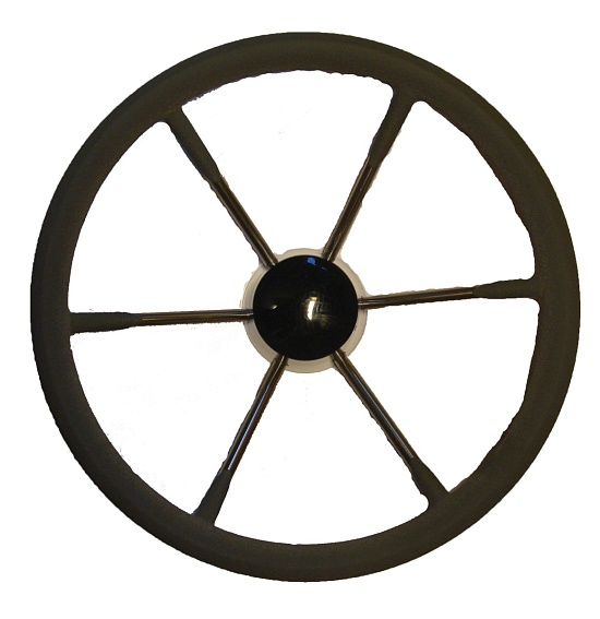 Рулевое колесо шестиспицевое, диаметр 350 мм, серое. Материал: нержавеющая сталь, полиуретан. Страна-производитель – Тайвань.