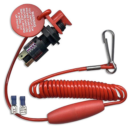 Витой шнур с карабином и выключателем. Применяется для аварийной остановки двигателей. Универсальный — имеет две пары контактов (нормально замкнутые и нормально разомкнутые), благодаря чему может использоваться как с подвесными, так и со стационарными двигателями. В случае падения судоводителя за борт, глушит двигатель. Снабжен дополнительным поплавком.